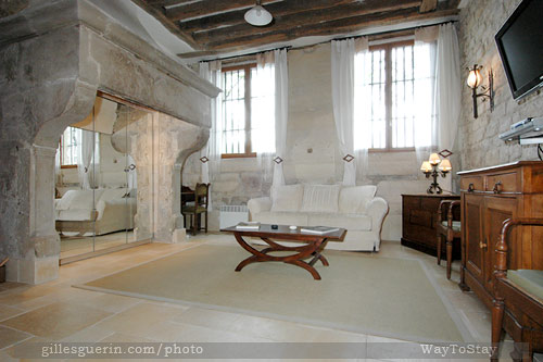 > Île Saint Louis - Coin séjour avec ancienne cheminée
